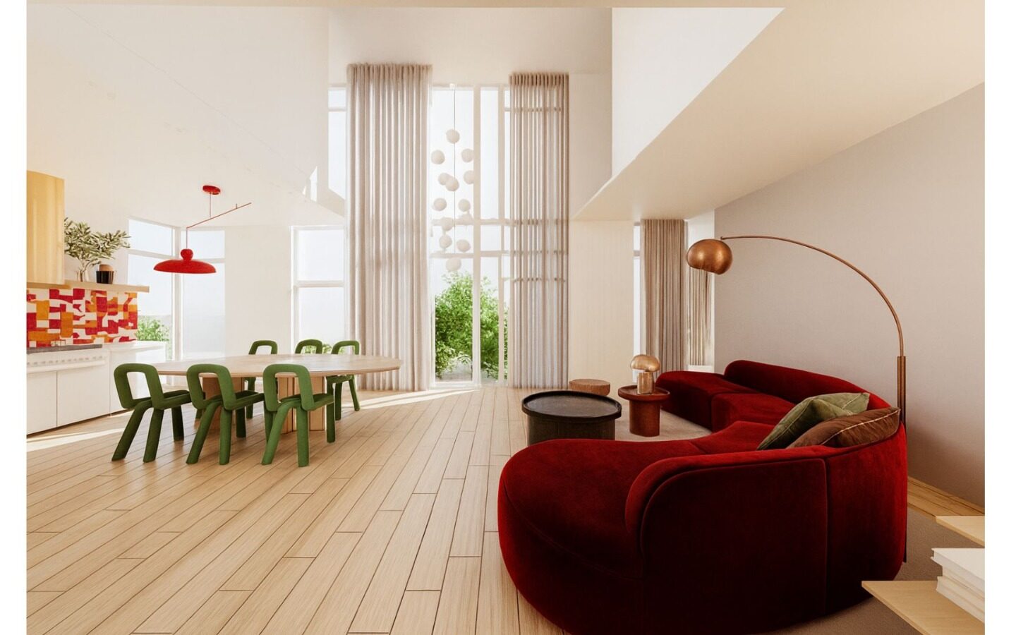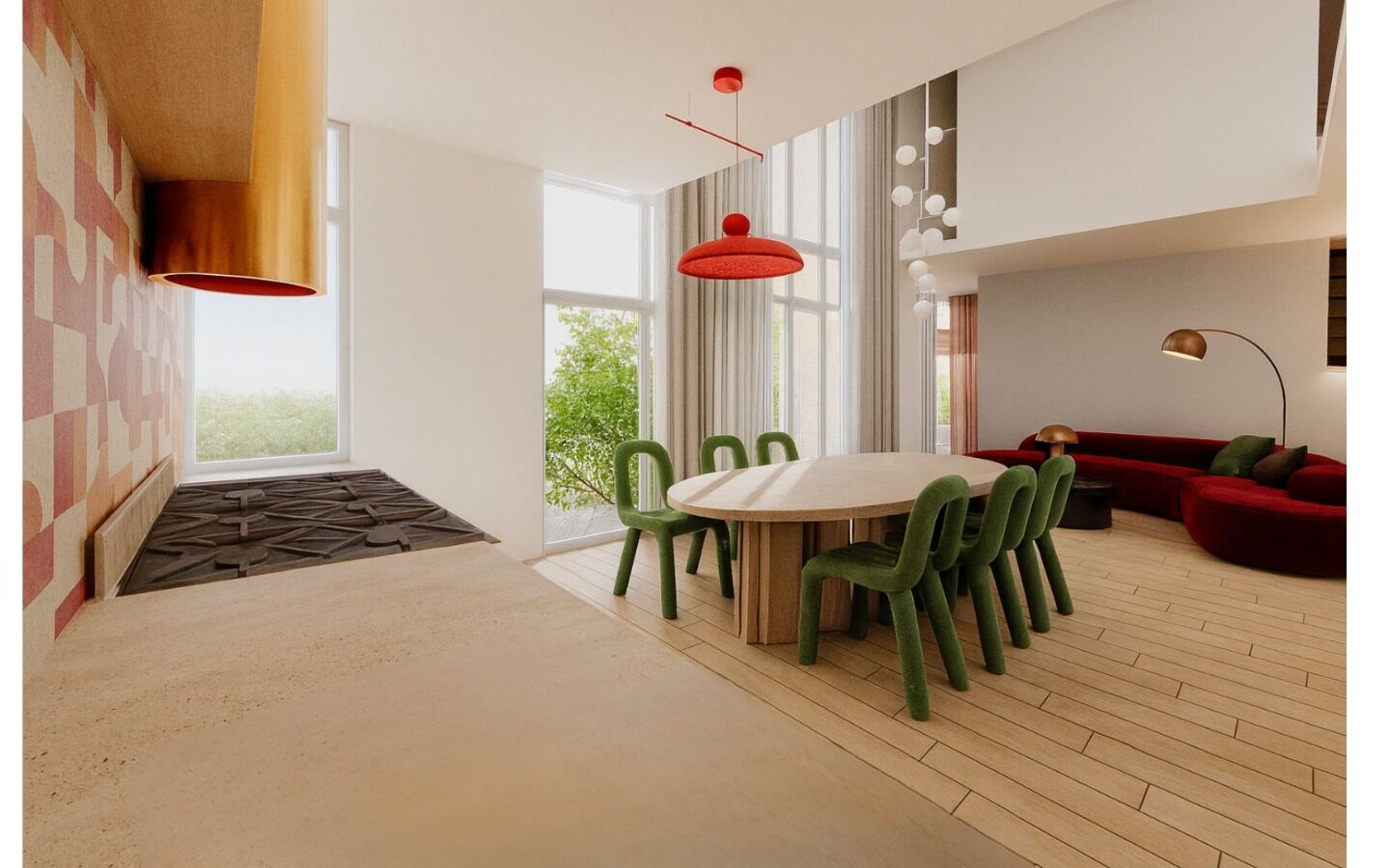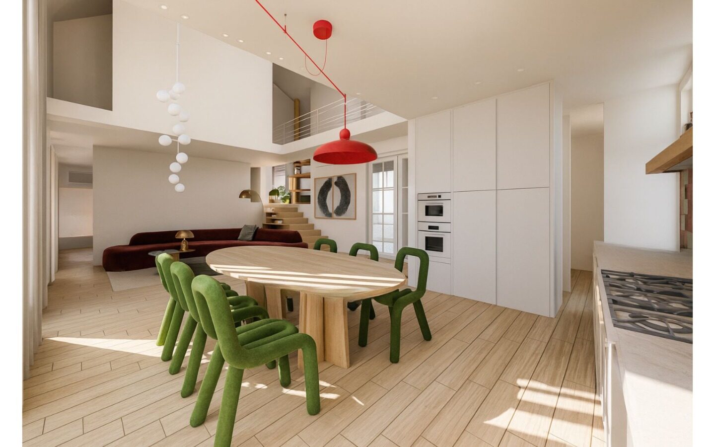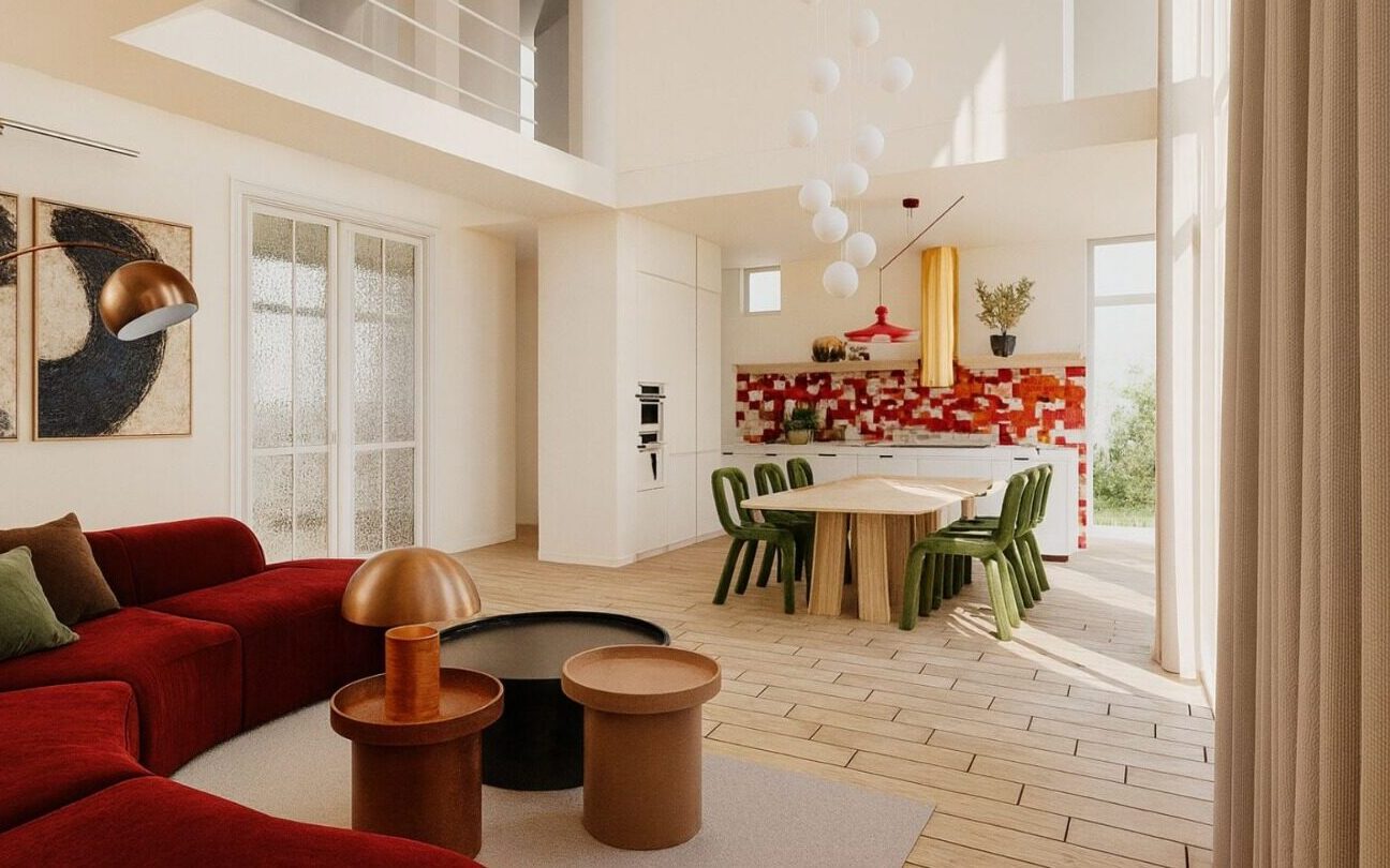 Serce domu to dwukondygnacyjny salon, w którym biel ścian i sufitów stanowi tło dla odważnych decyzji kolorystycznych. Przestrzeń nie została tu “zagracona”, lecz umeblowana formami, które działają jak dzieła sztuki. Wzrok przyciąga przede wszystkim welurowa sofa w odcieniu głębokiego wina, której organiczny, wijący się kształt przełamuje surowość prostych kątów architektury.
